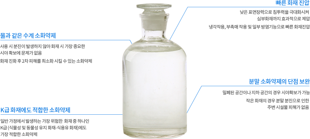 - 분말 및 가스 계 소화약제가 제어하지 못하는 K급 화재(식용유화재)에도 매우 효과적입니다.